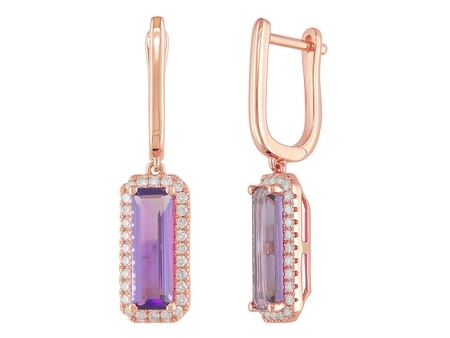 14K Rose Gold Elongated Elegance North South Set Amethyst with Diamond Halo Dangle Earrings