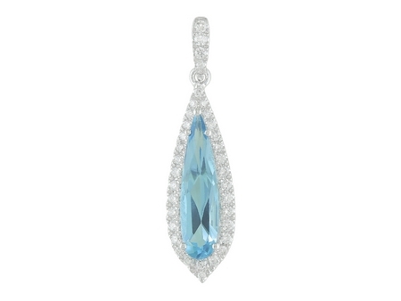 14K White Gold Elongated Elegance North South Set Blue Topaz with Diamond Halo Pendant